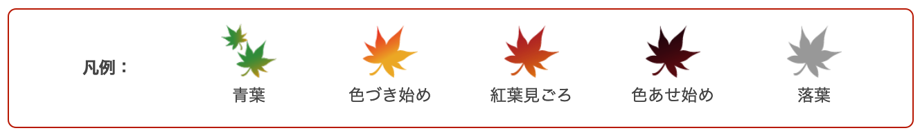 到樹上楓葉全體轉紅(黃)的時間就稱為「見頃(みごろ)」,見頃也被認為楓葉的最佳觀賞期